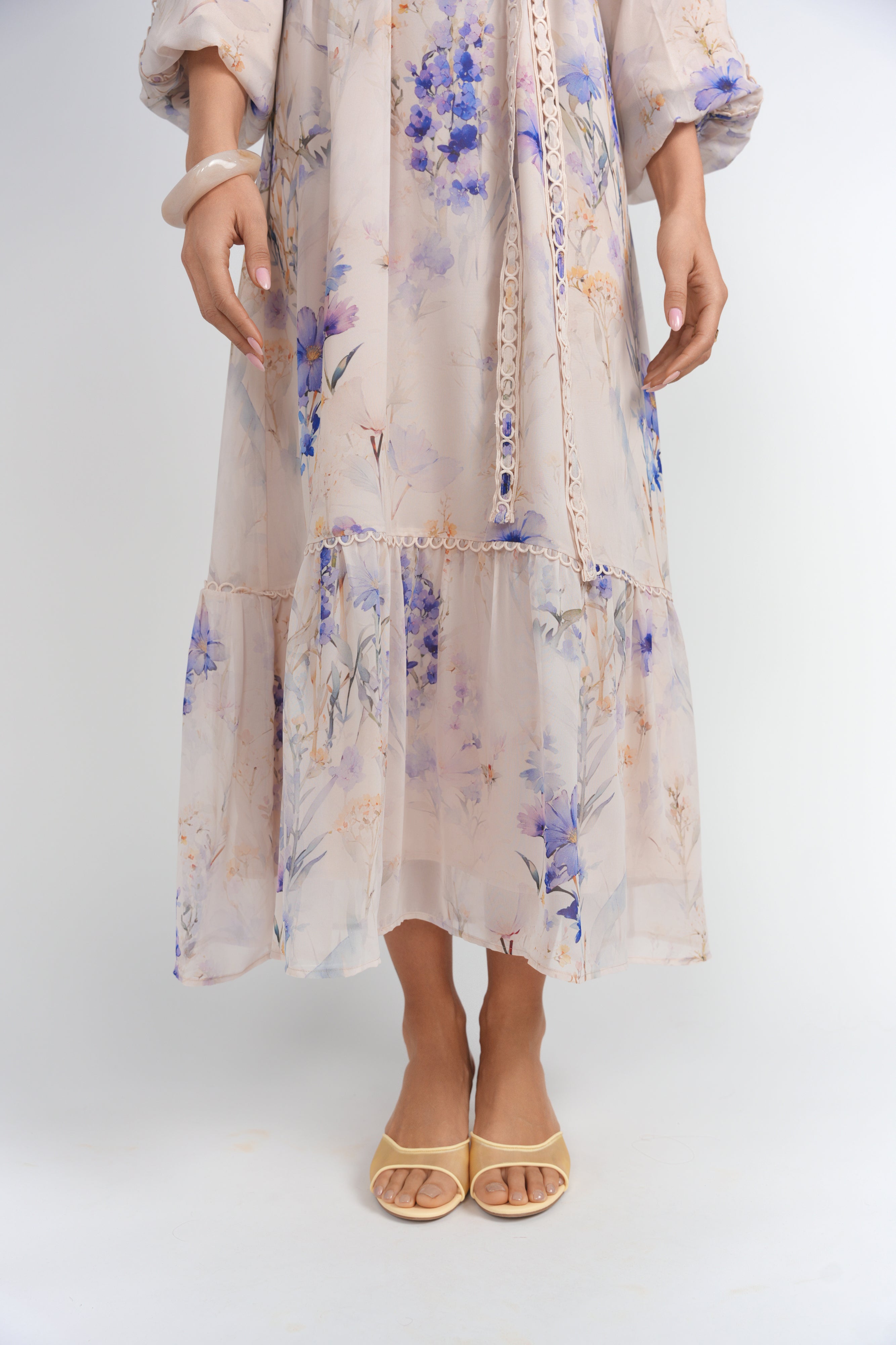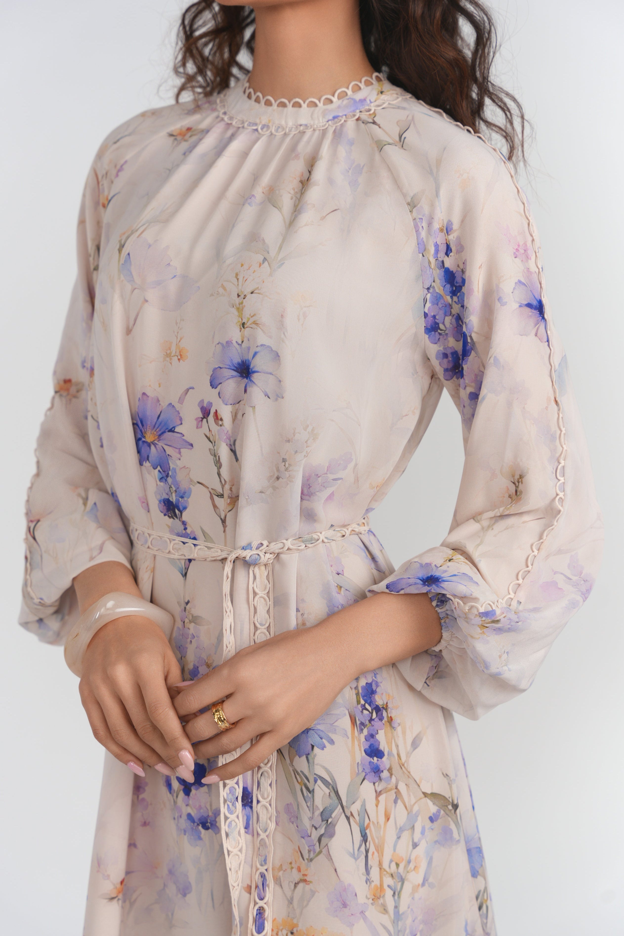 Soft and elegant, this chiffon dress is designed to make a statement with its flowing silhouette and beautiful floral print. Finished with delicate lace details throughout, it’s an effortlessly feminine piece made for special moments.