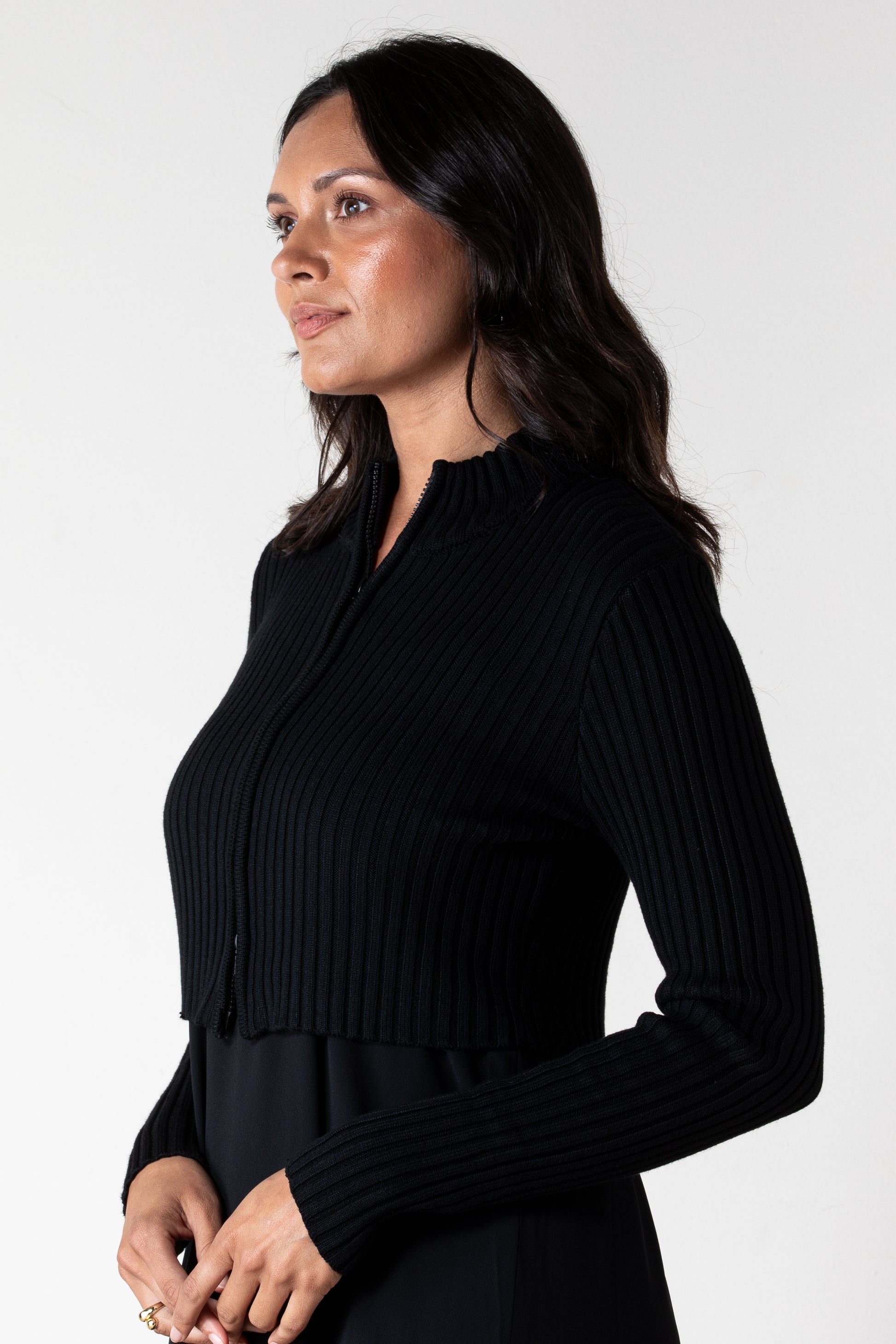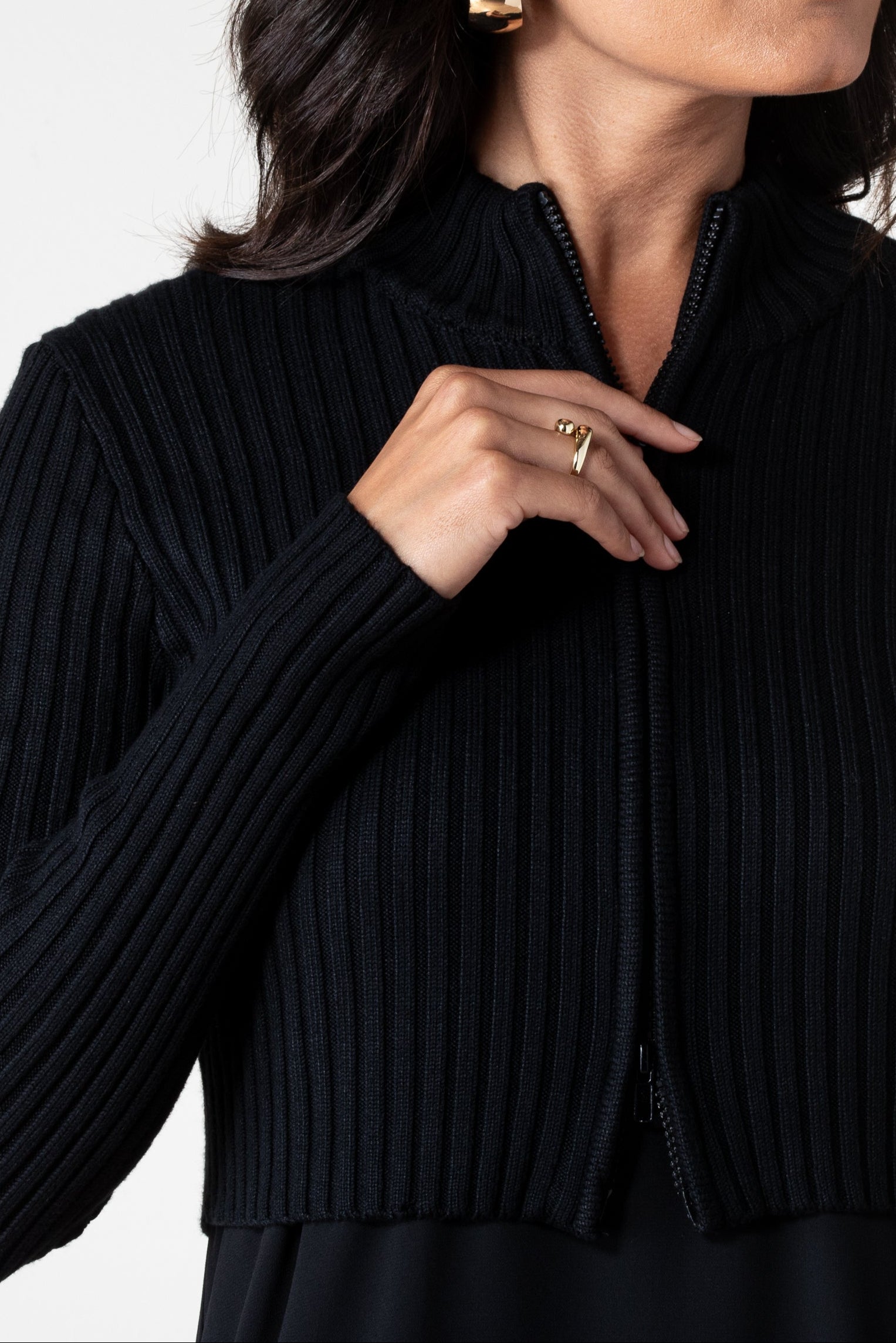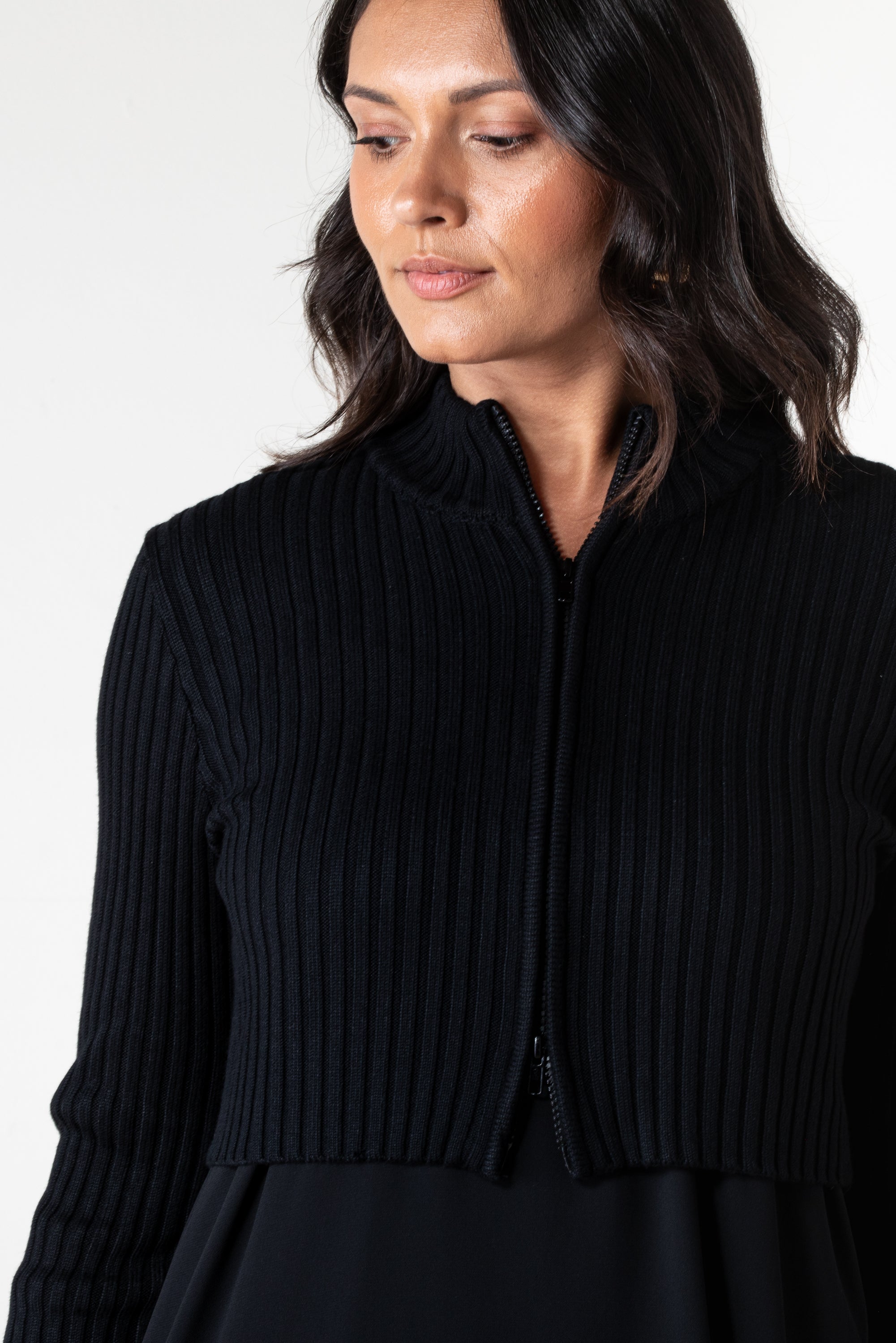 This chunky knit sweater is the ultimate cozy layering piece. With its thick ribbed texture and double-way zipper, you can wear it zipped up for that cozy look or open for effortless layering — either way, it's the kind of staple you'll reach for all season long.
