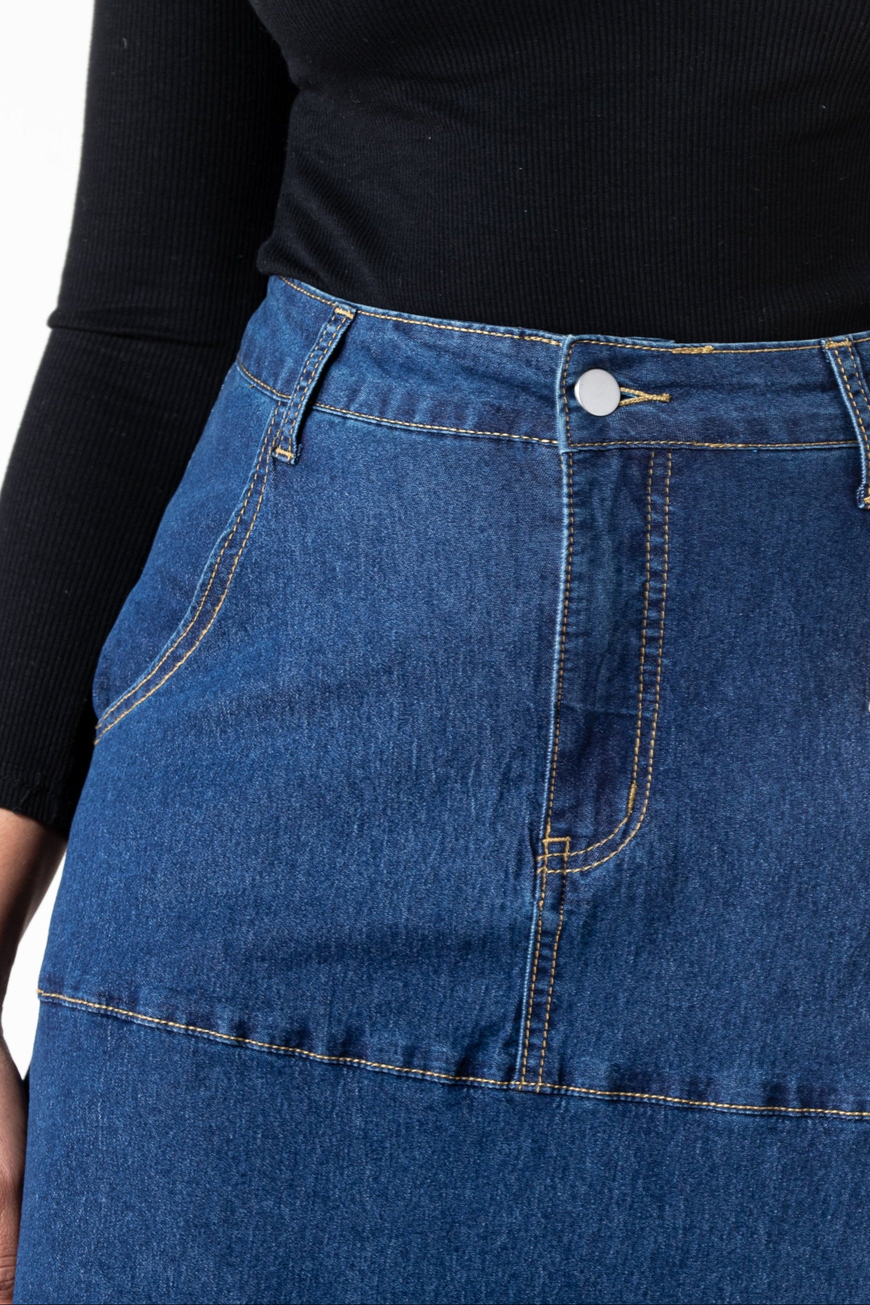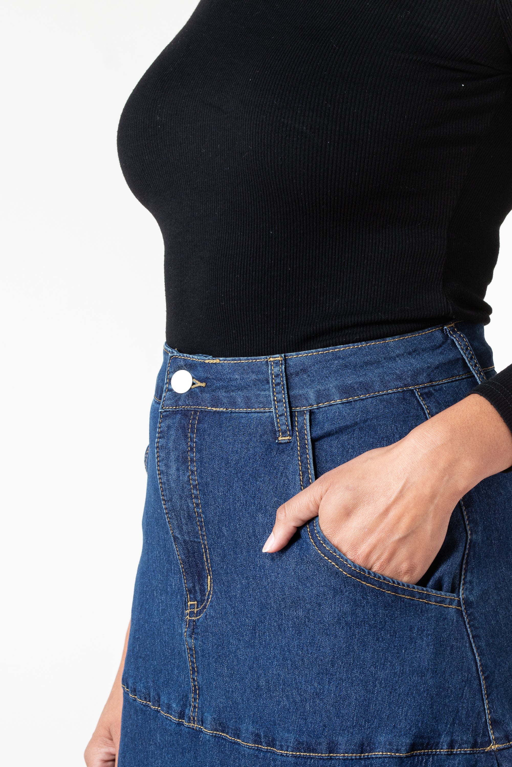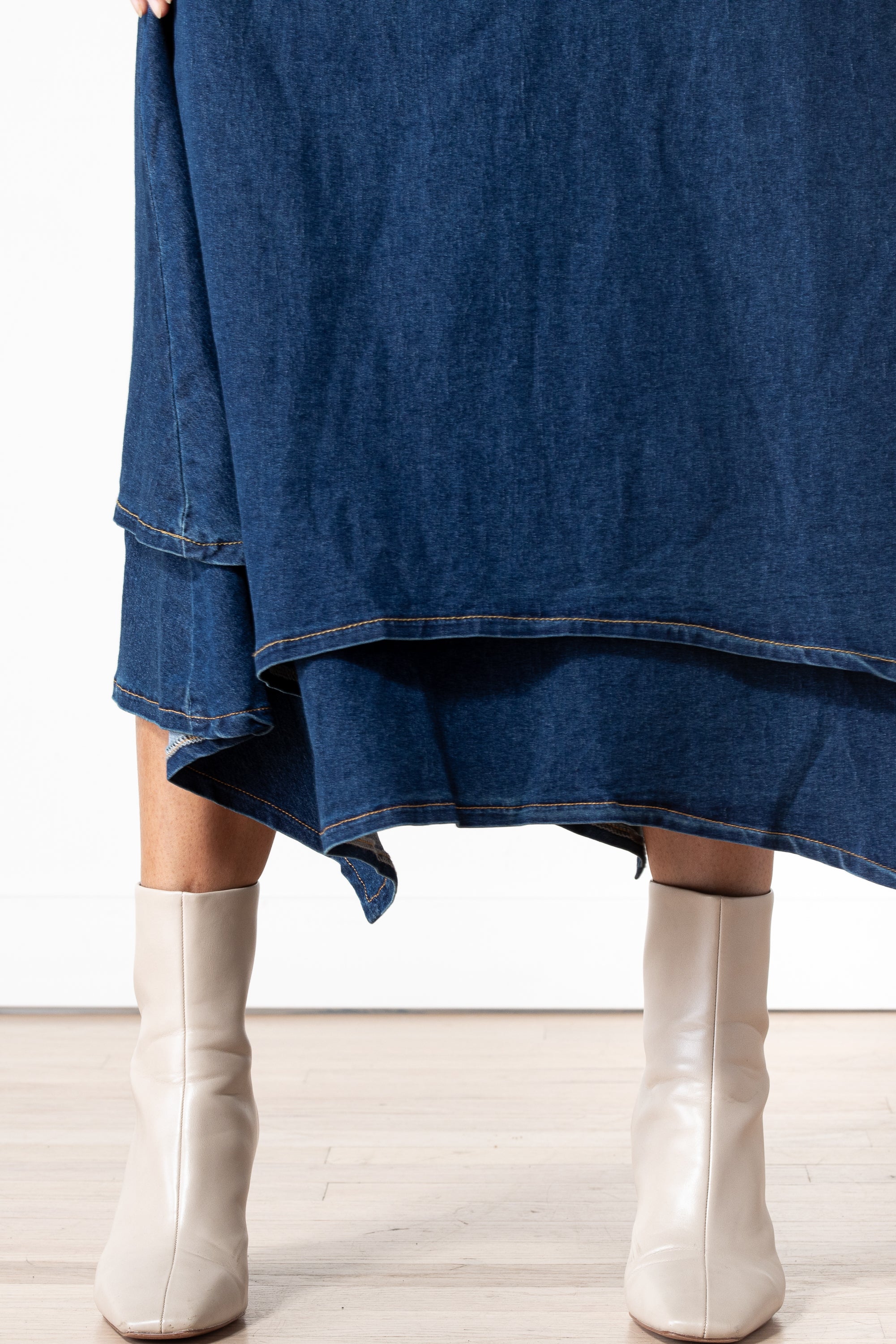 This denim midi skirt is a standout twist on a classic. Designed with angled seamwork and tiered construction for a fresh, dimensional shape, it combines structure with just the right amount of flow. With its flattering fit and stretchy, comfortable denim, this piece blends everyday ease with a modern edge.