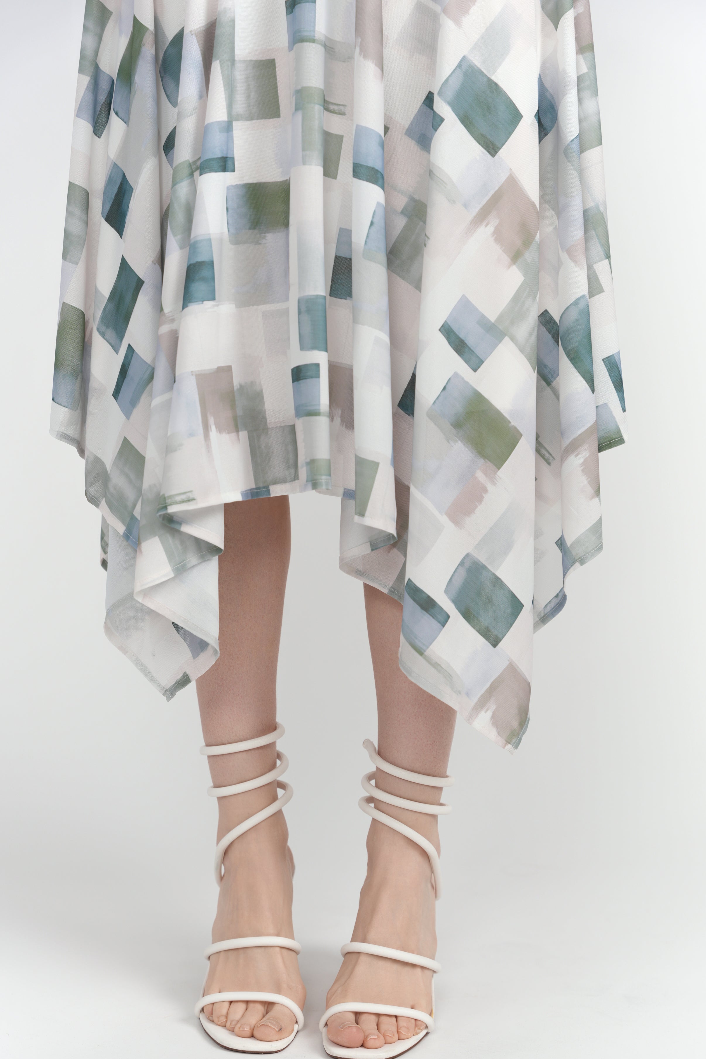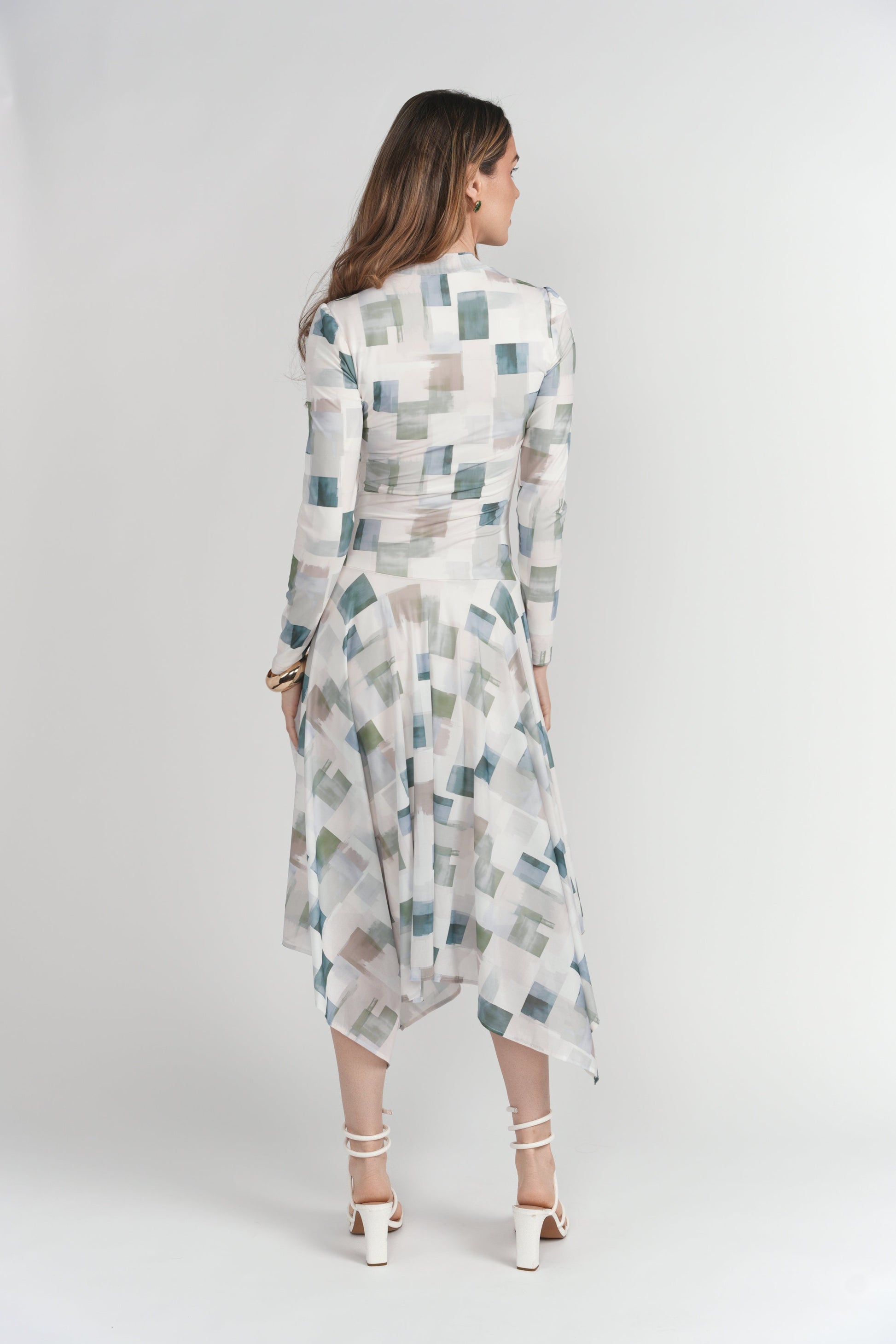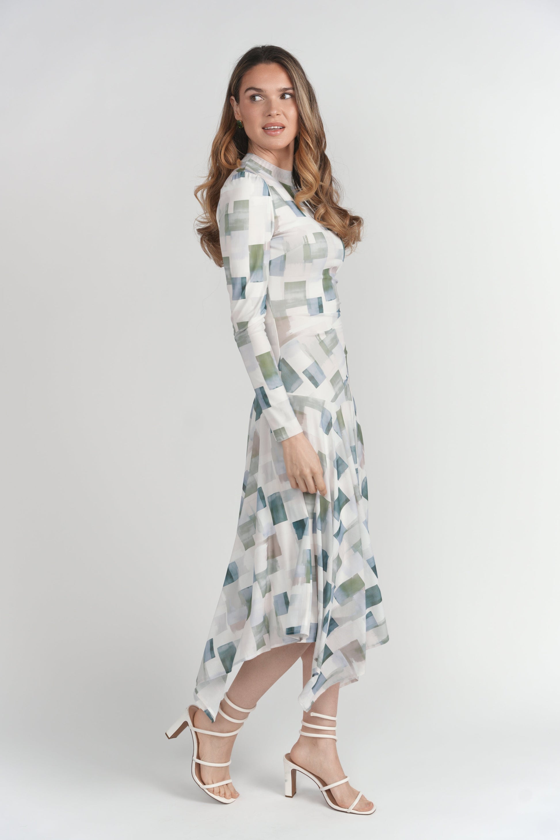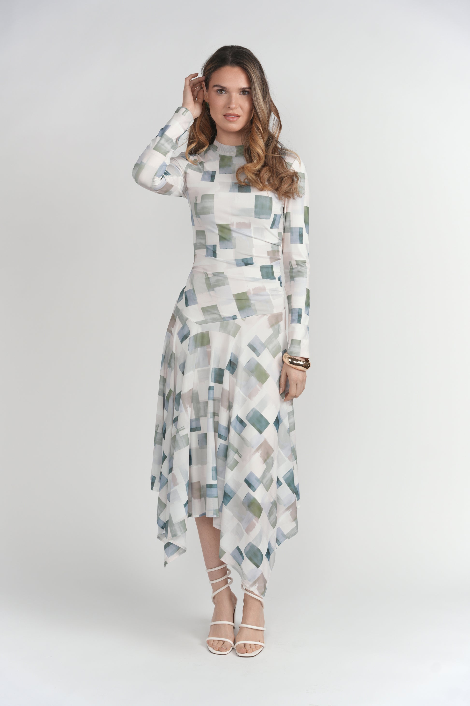 - Slight puff sleeve detail at the shoulder seam, side-seam ruching, drop waist, and handkerchief hem for dynamic shape and movement.