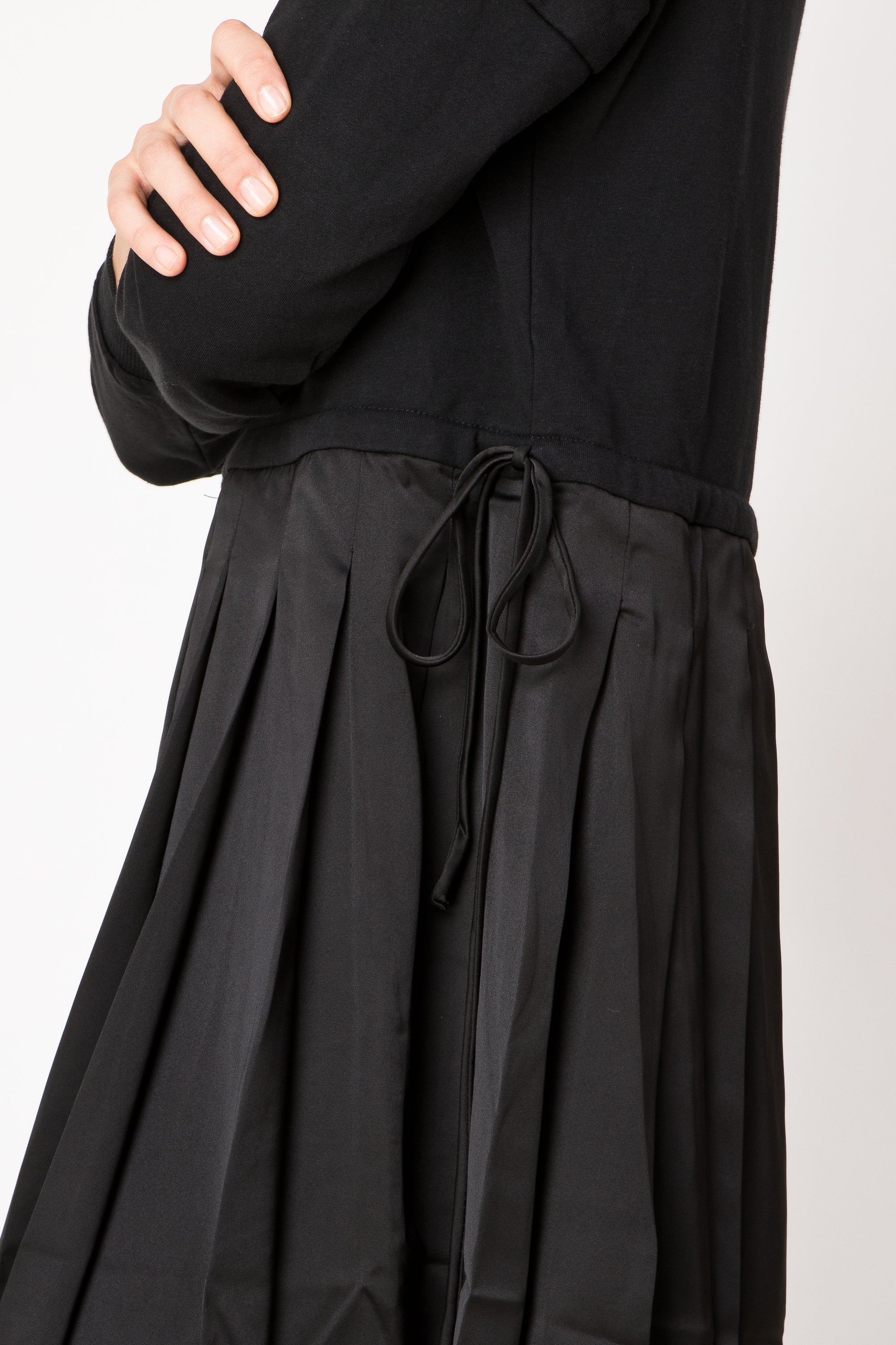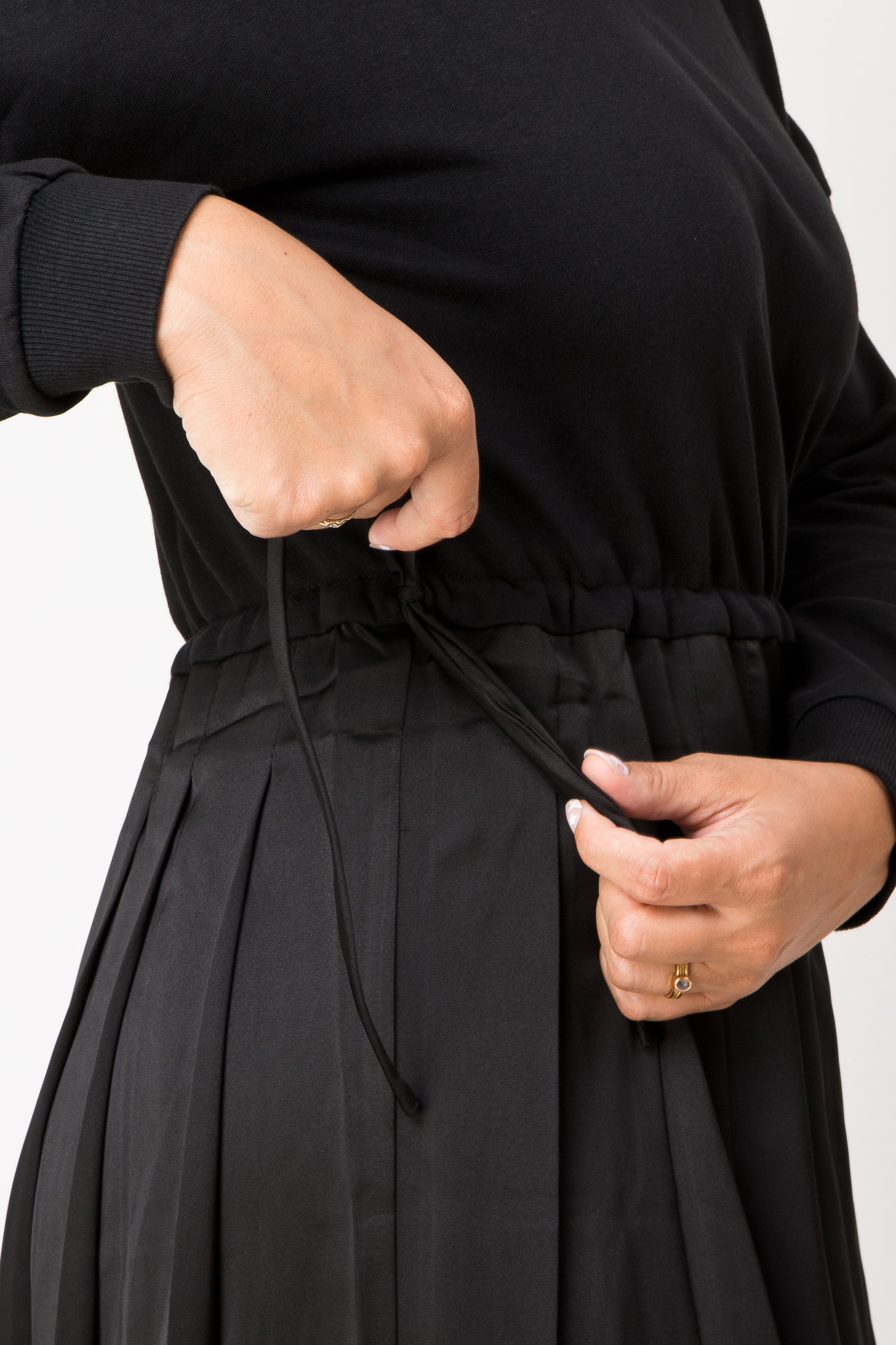 Introducing the Oberon Dress, designed to seamlessly blend casual comfort with a touch of sophistication. This dress features an oversized fit with a drawcord at the waist, allowing you to choose between a relaxed, loose look or a more cinched, tailored silhouette. The sweatshirt-style top pairs effortlessly with a slip-style pleated bottom, making it incredibly easy to dress up for business or down for casual outings.