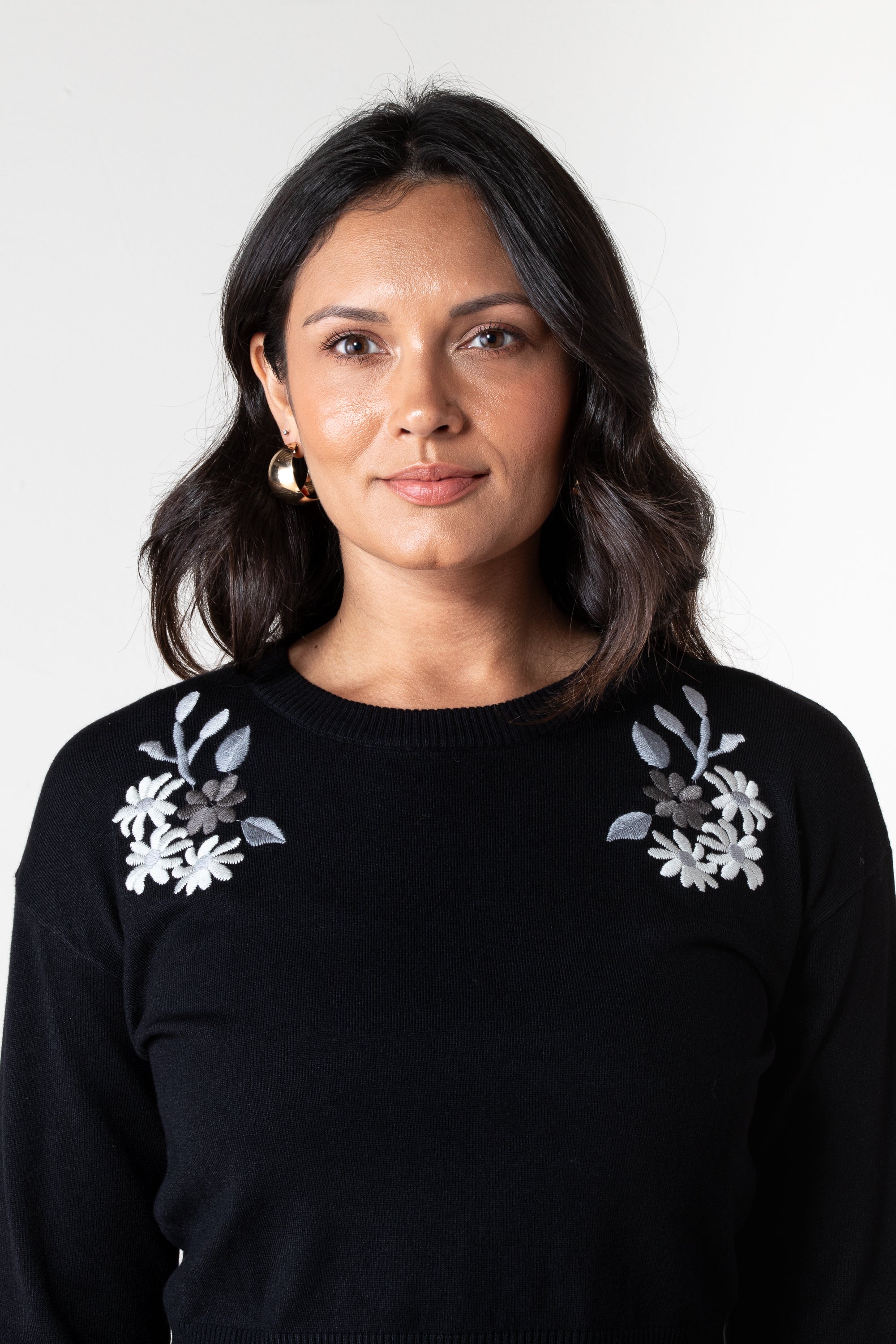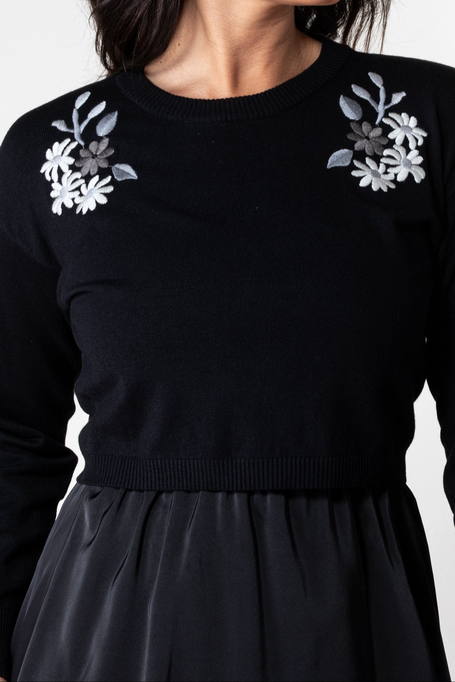 This two-piece set pairs a cropped, embroidered sweater with a silky slip dress featuring adjustable straps and a beautifully tiered A-line skirt. Perfect for a night out or elevated even further for special occasions, it offers a versatile, feminine look that’s flattering both layered, or even worn solo.