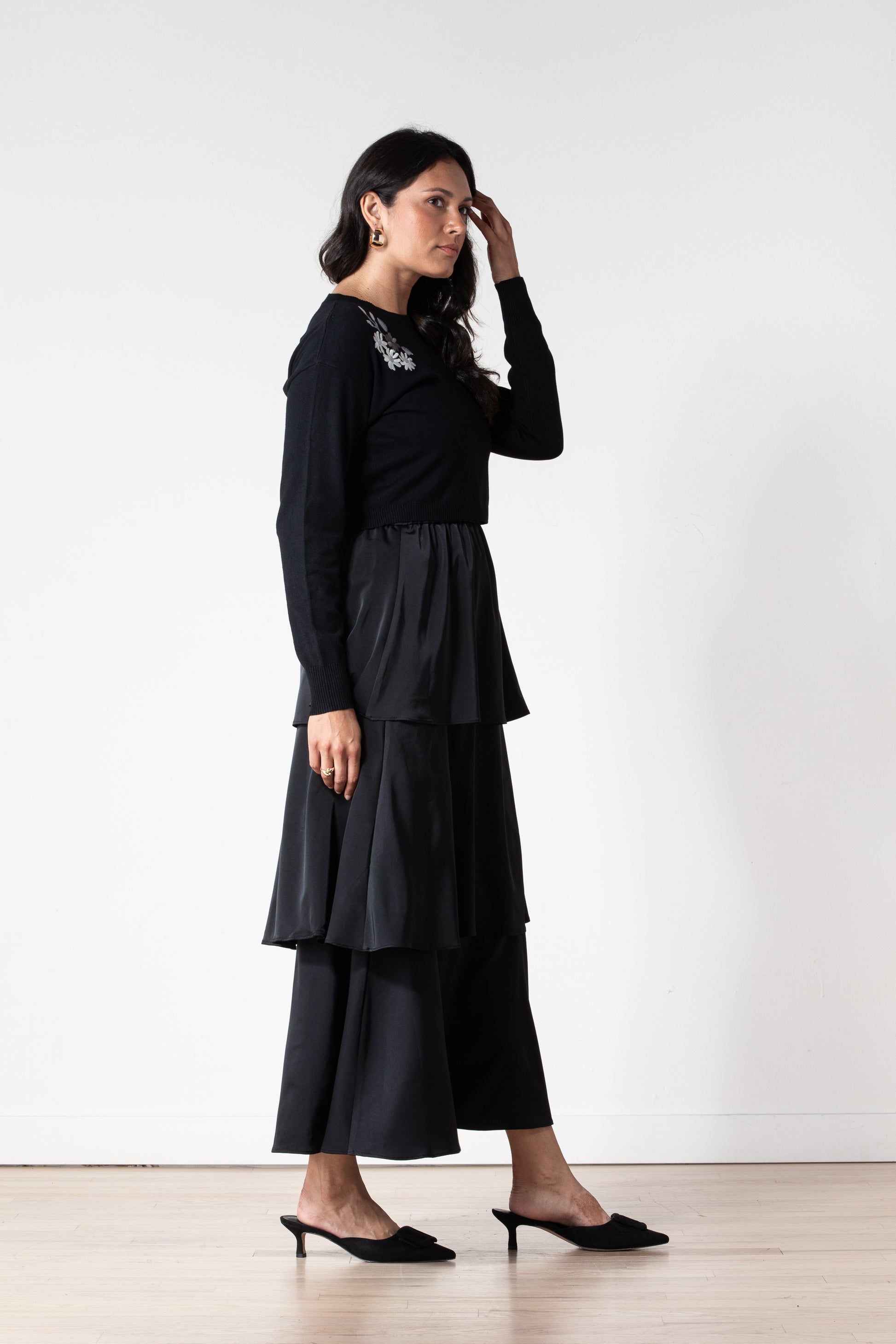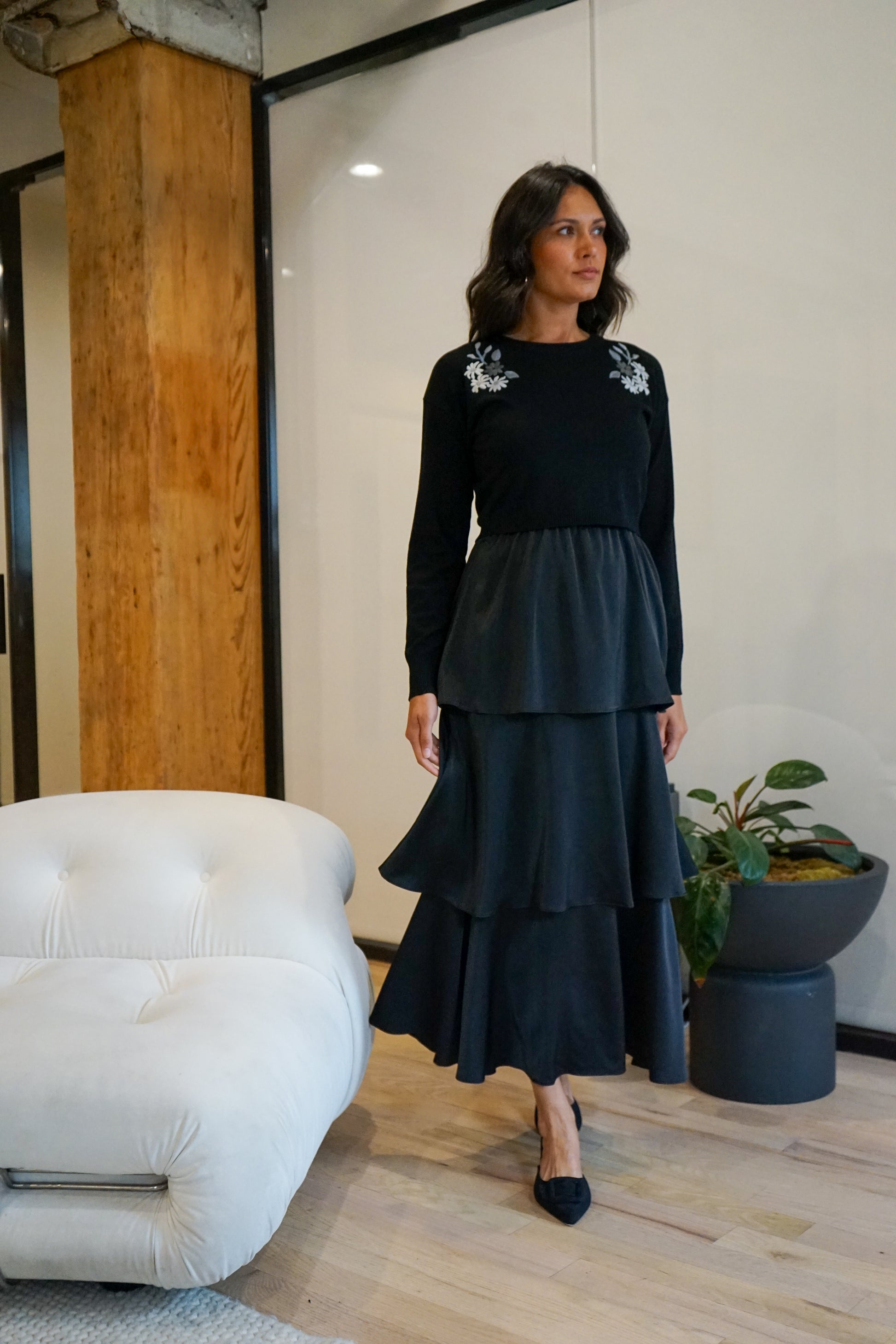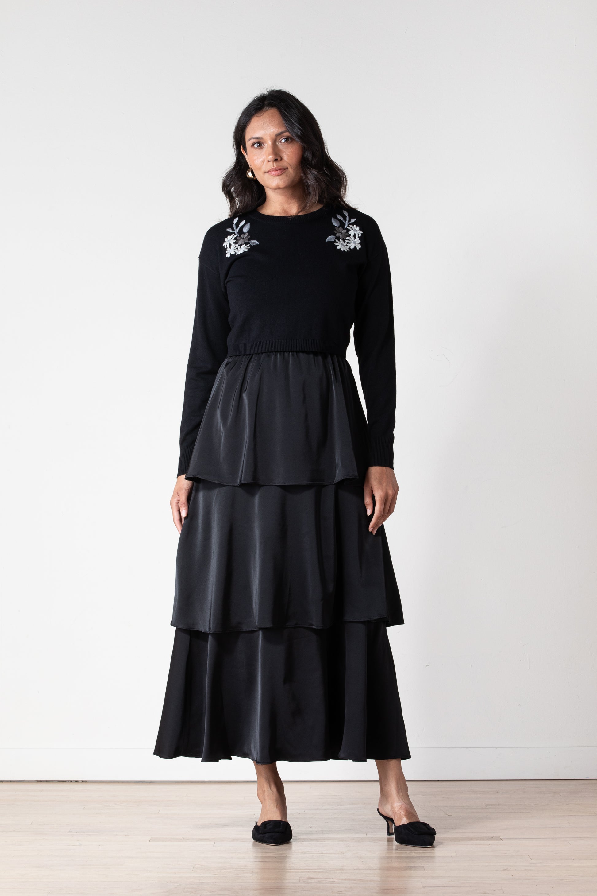 This two-piece set pairs a cropped, embroidered sweater with a silky slip dress featuring adjustable straps and a beautifully tiered A-line skirt. Perfect for a night out or elevated even further for special occasions, it offers a versatile, feminine look that’s flattering both layered, or even worn solo.
