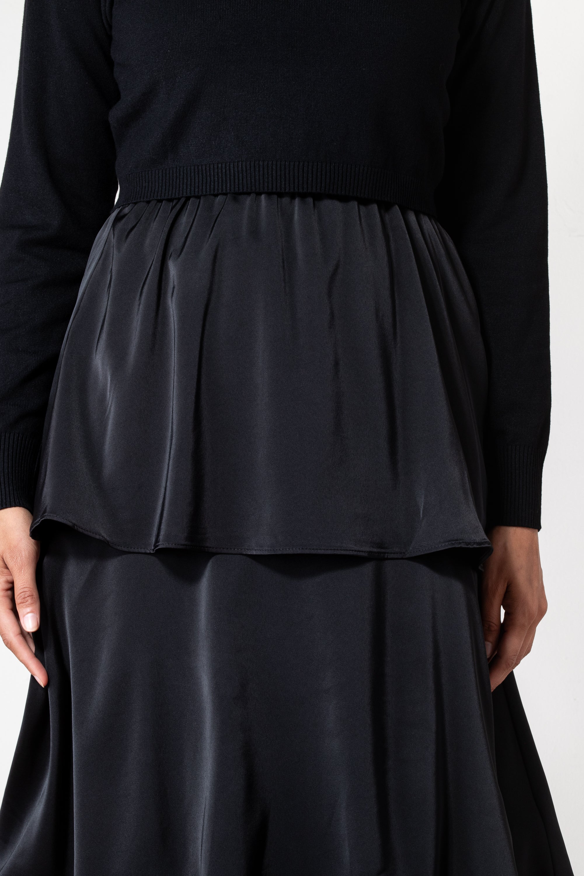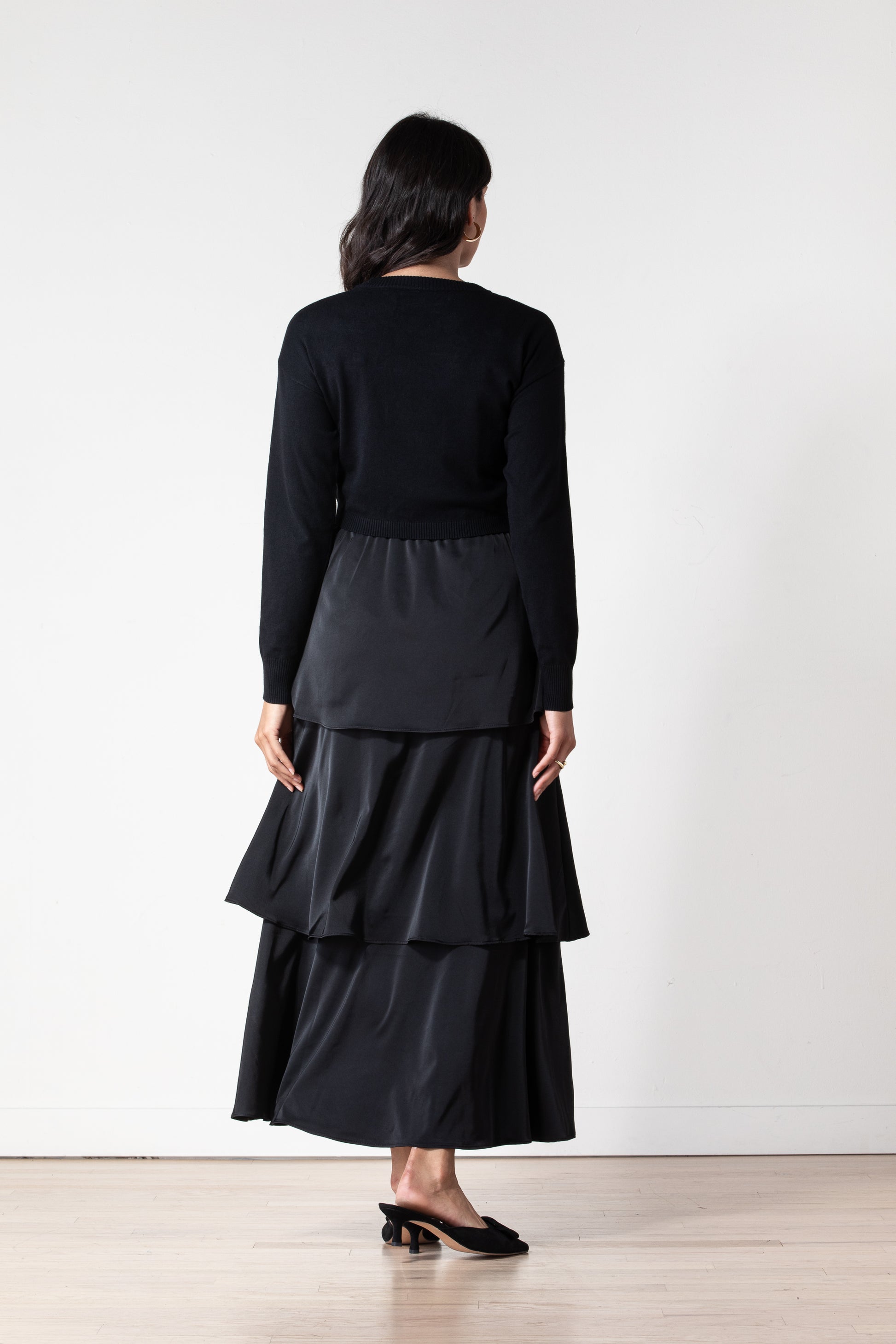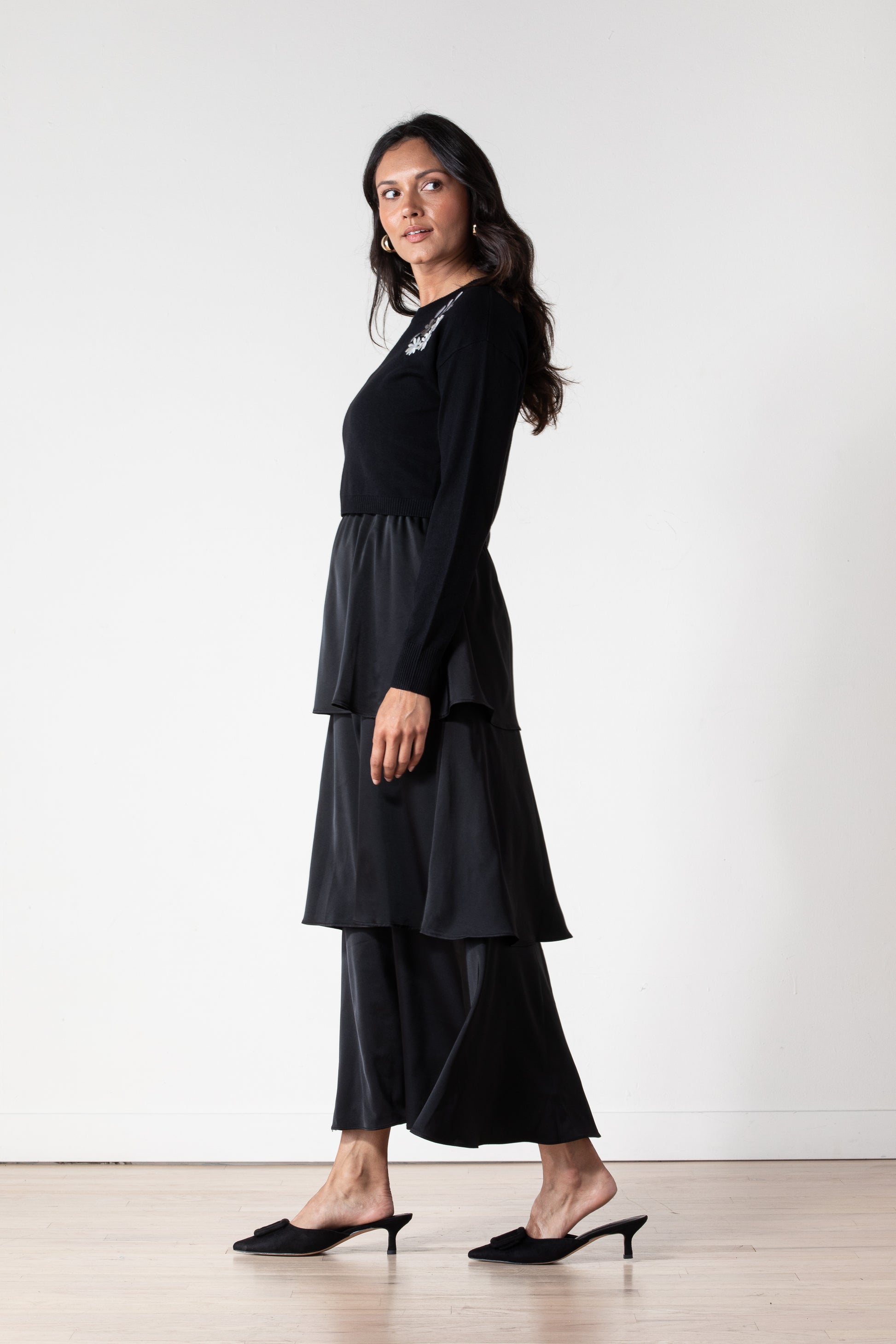 This two-piece set pairs a cropped, embroidered sweater with a silky slip dress featuring adjustable straps and a beautifully tiered A-line skirt. Perfect for a night out or elevated even further for special occasions, it offers a versatile, feminine look that’s flattering both layered, or even worn solo.