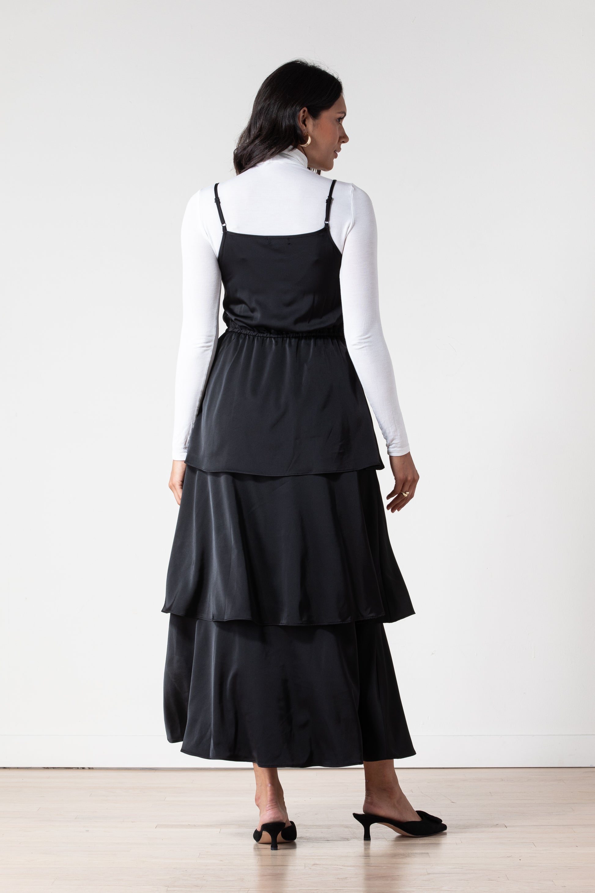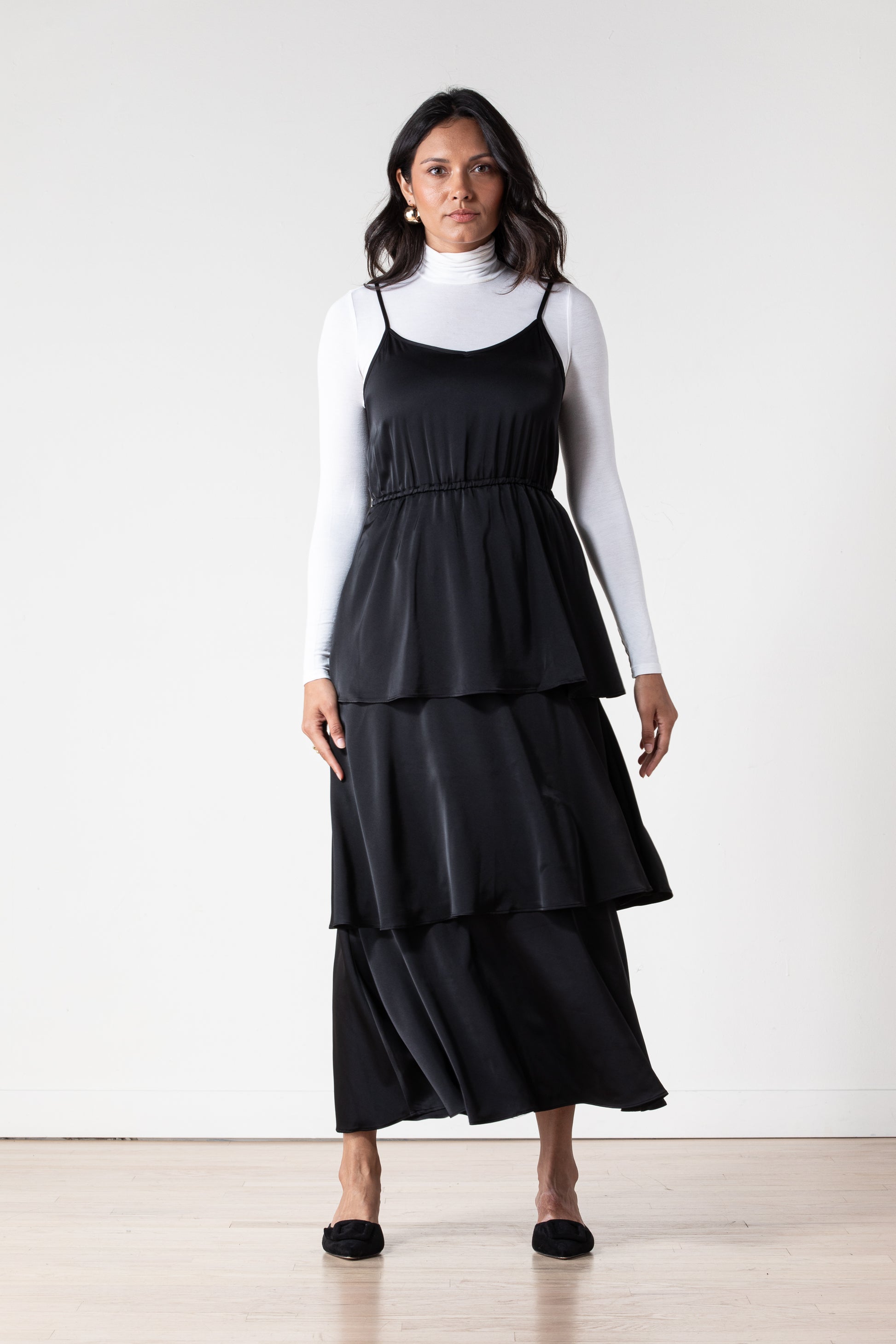 - Adjustable spaghetti straps and tiered A-line skirt offer flattering movement.