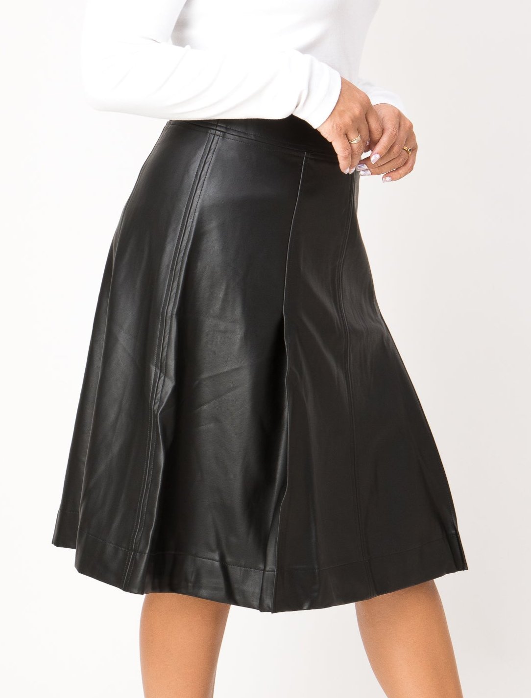 Elevate your wardrobe with our Rosalind Skirt, crafted from high-quality PU leather for a sleek, flattering fit. Versatile and stylish, this skirt is easy to dress up or down, with its lower-placed pleats creating a perfect flare, enhancing your silhouette only where you want it to.