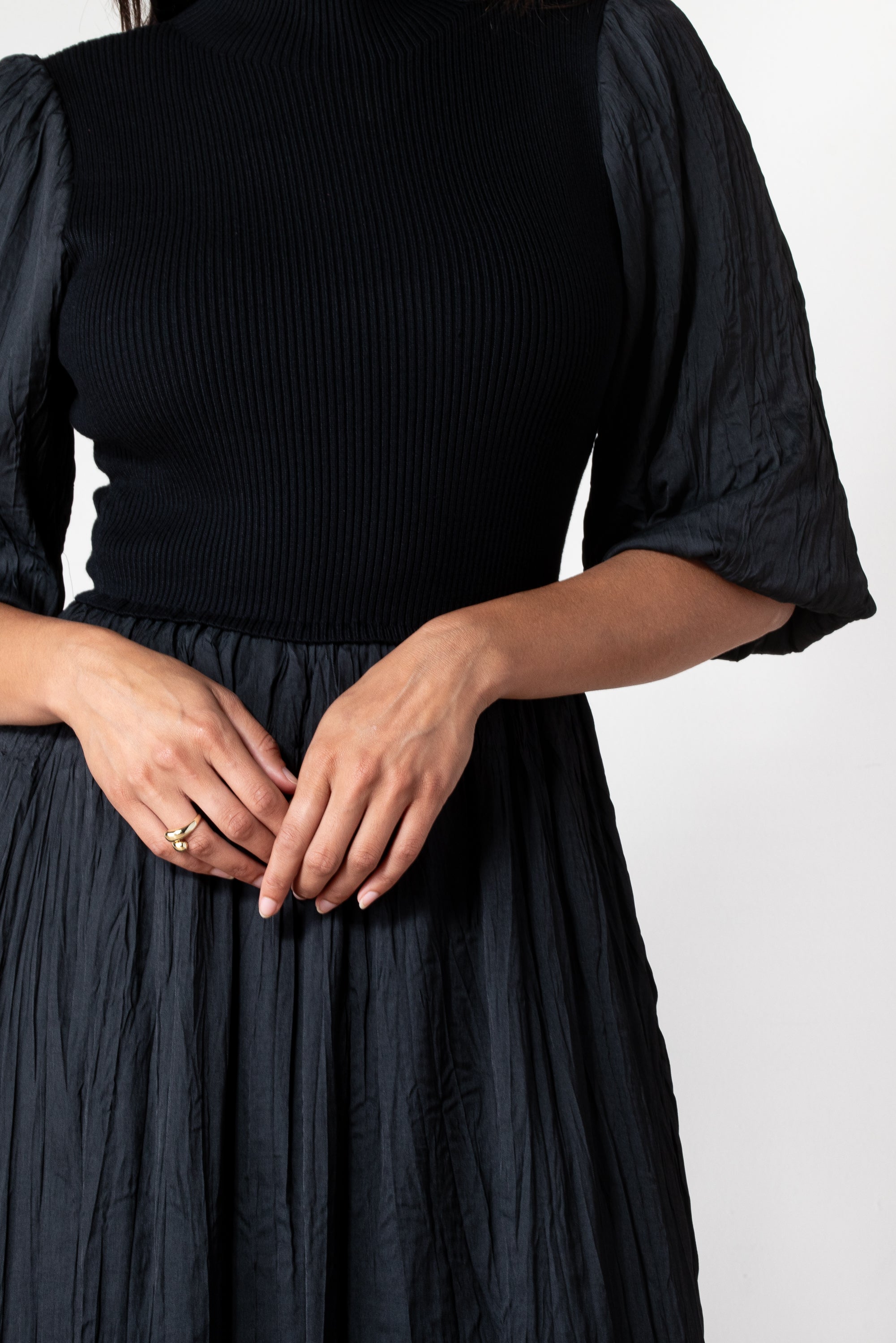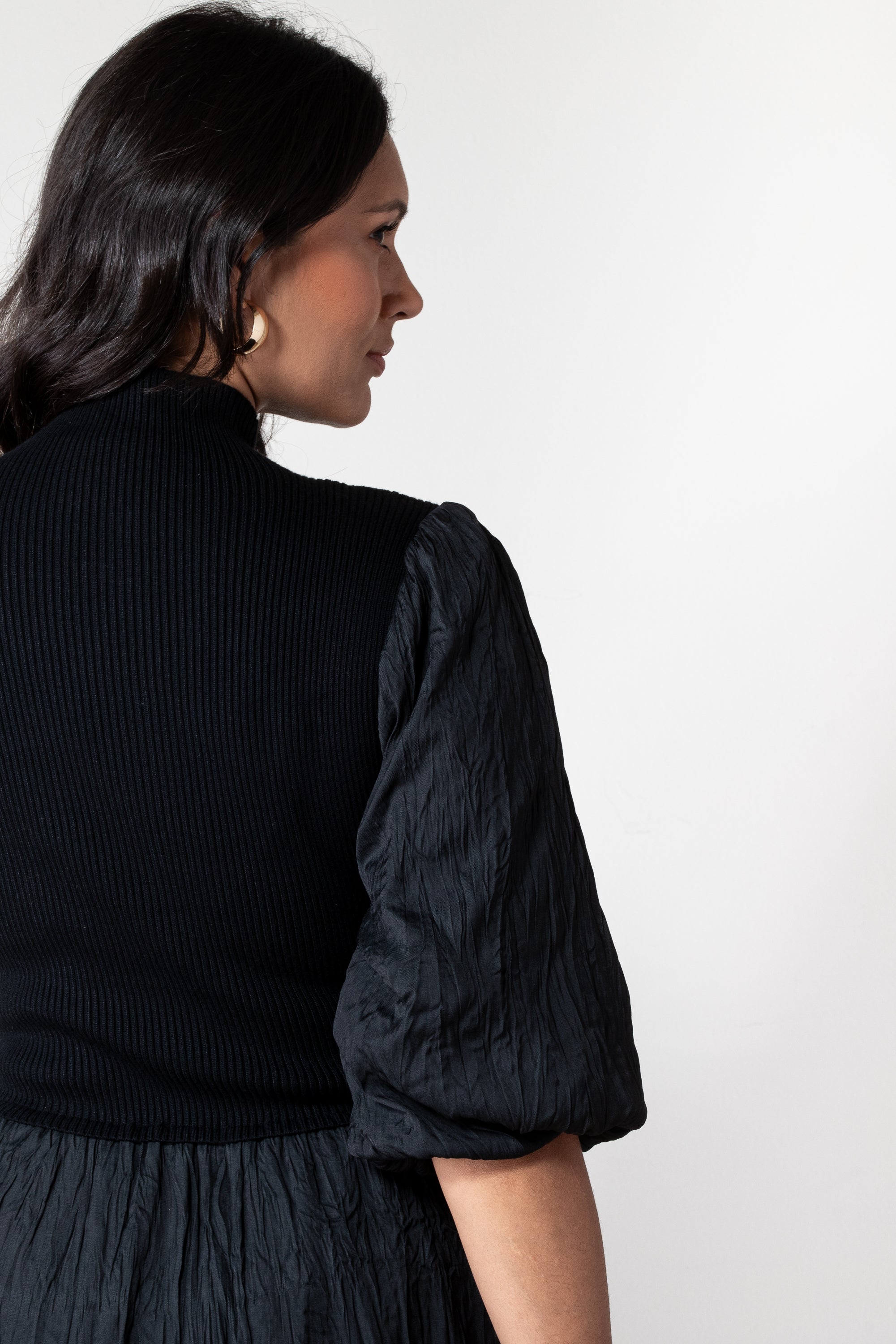- Ribbed knit top and crinkled woven fabric for skirt and sleeves.