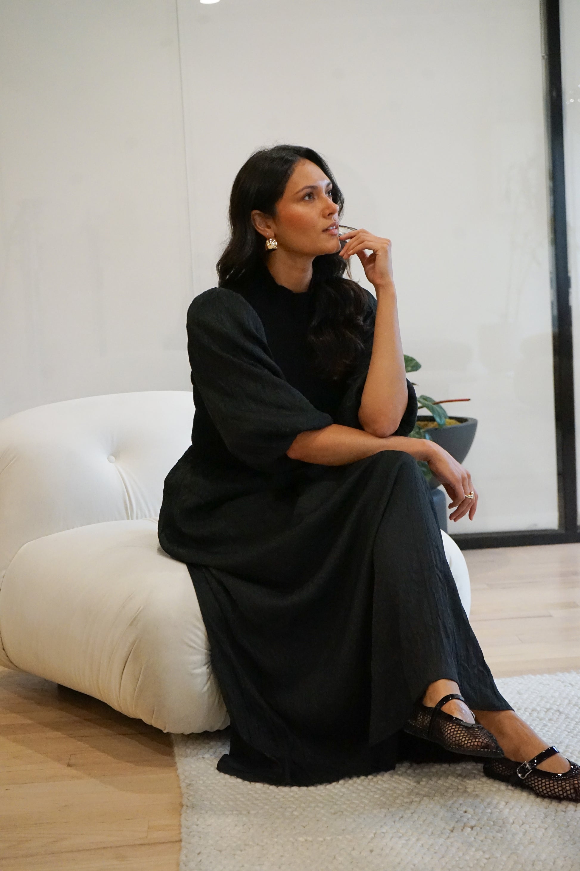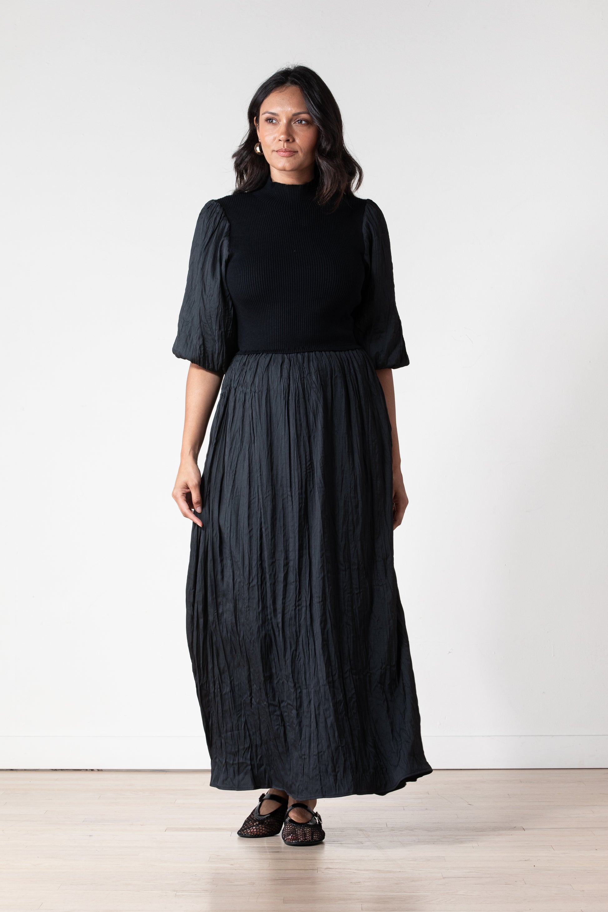This flowing maxi dress pairs a beautiful knit bodice with a subtly crinkled skirt for texture-rich contrast. Ideal for autumn layering or dressed up with heels for a special occasion, it brings quiet elegance to your wardrobe.