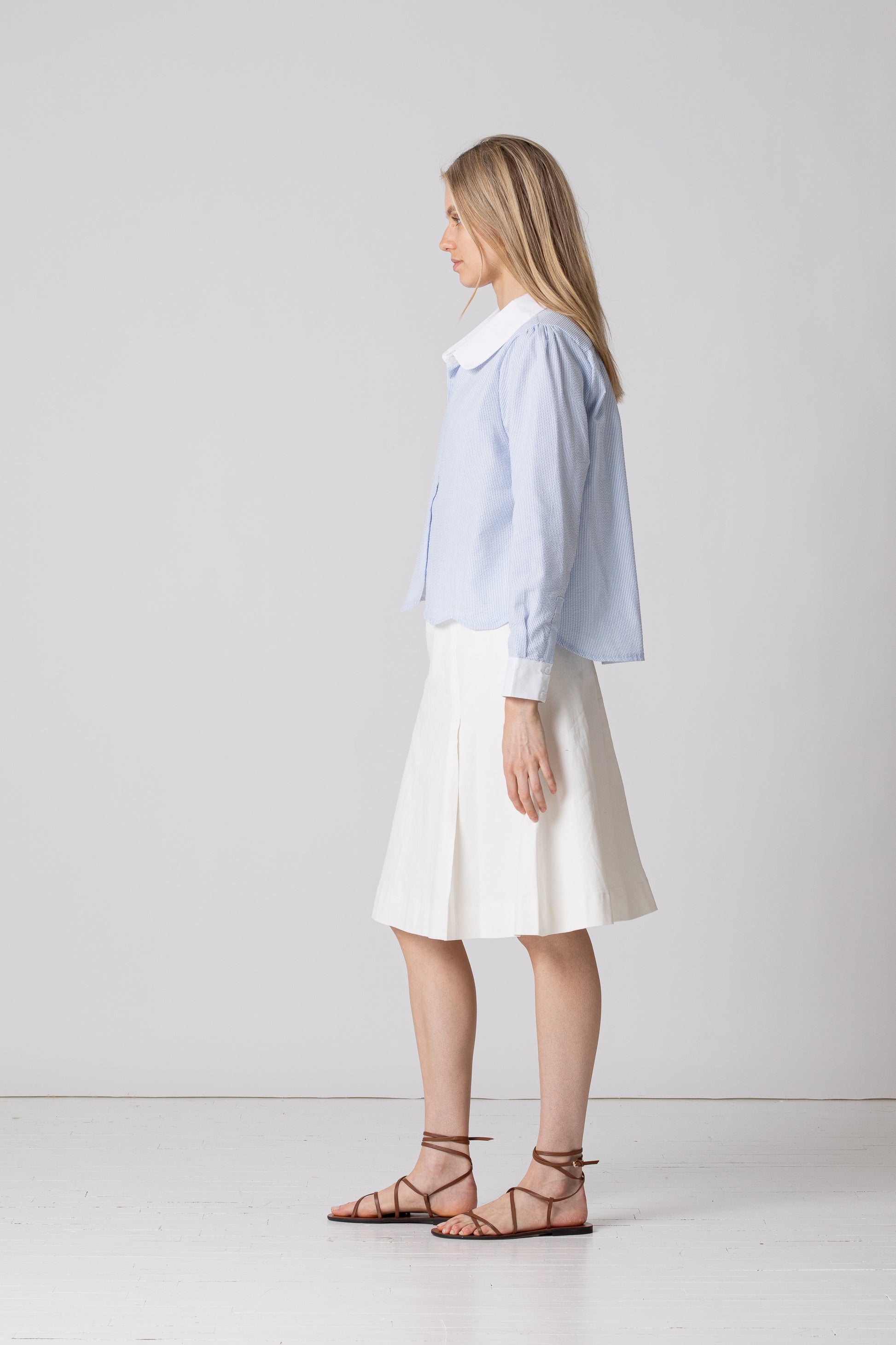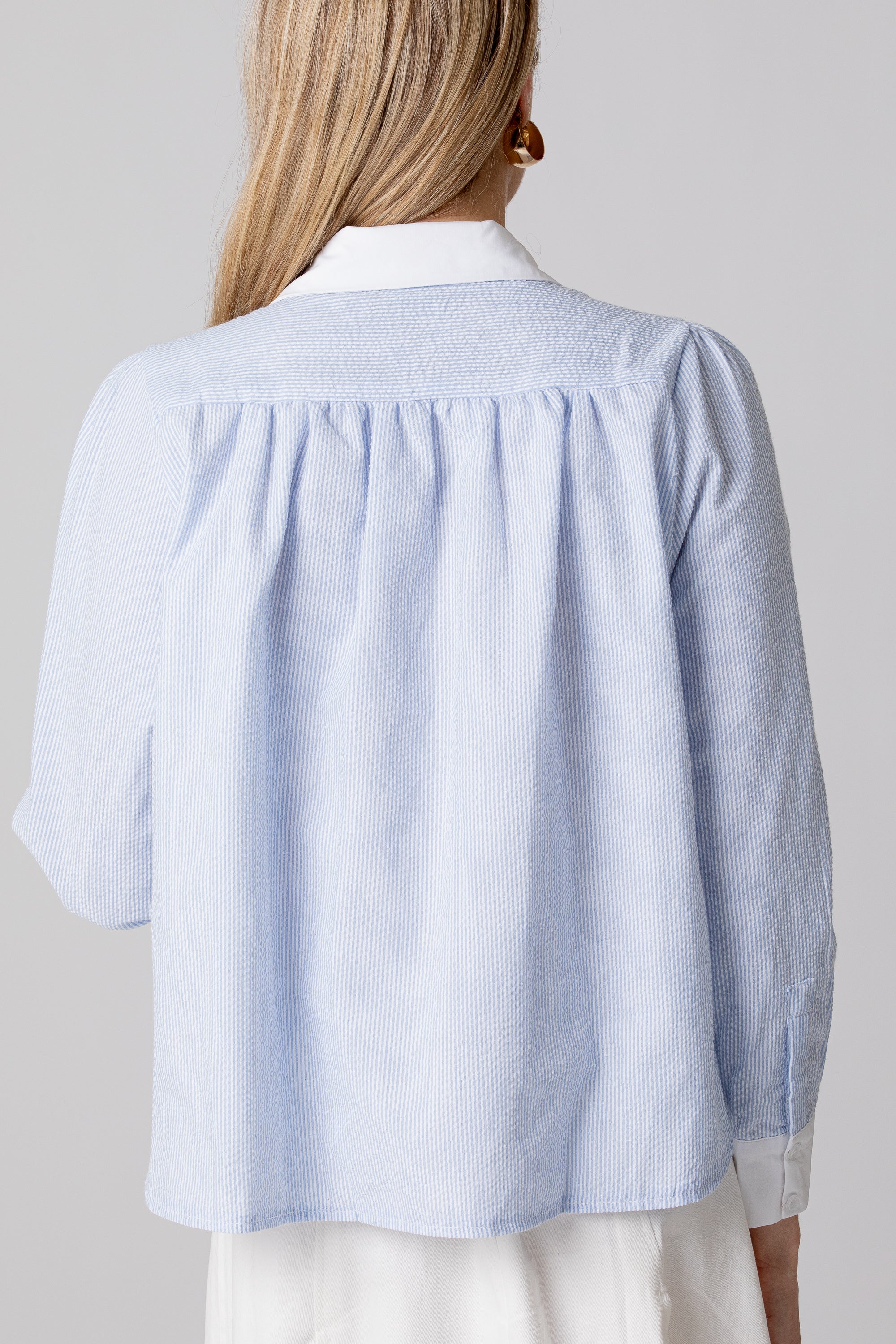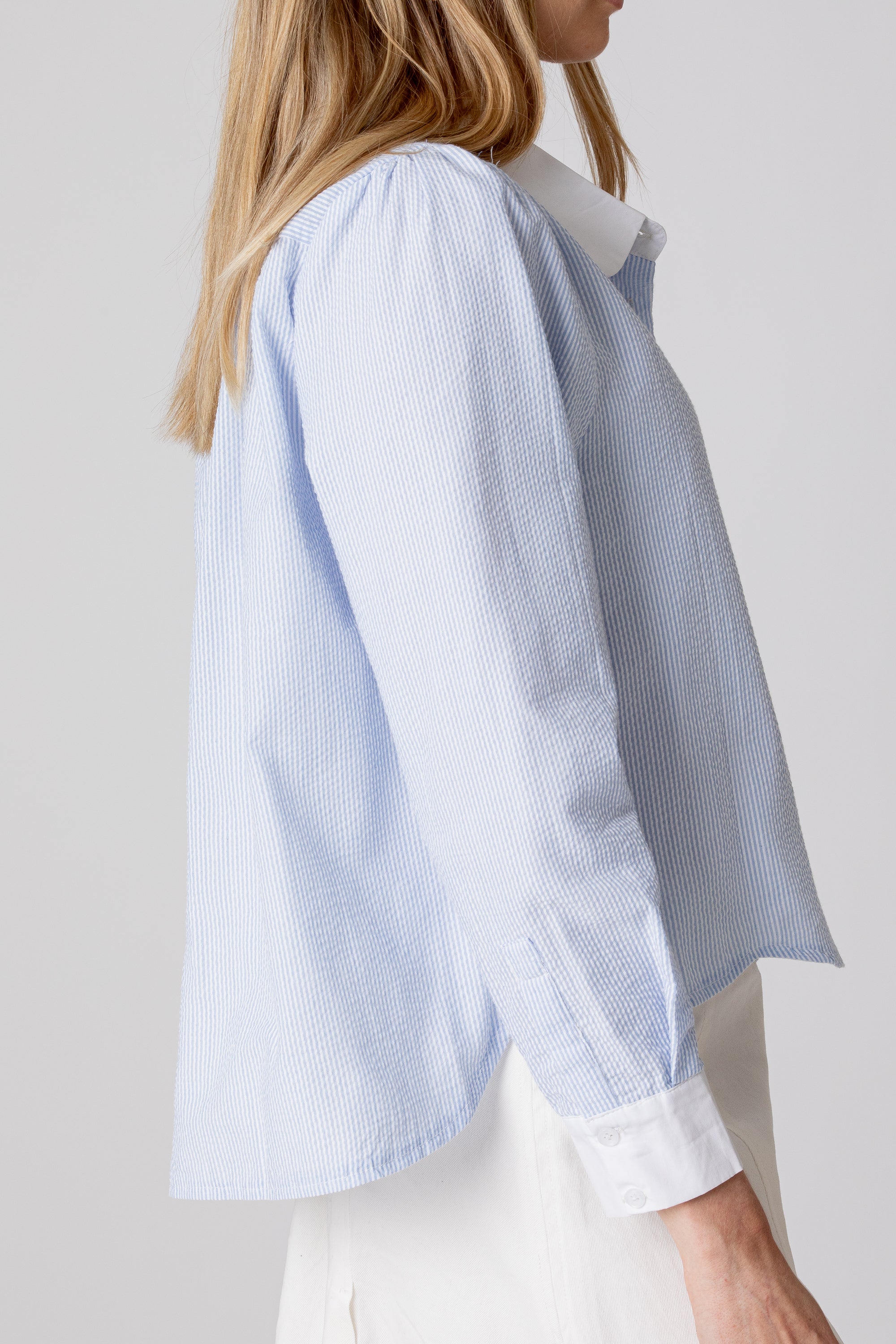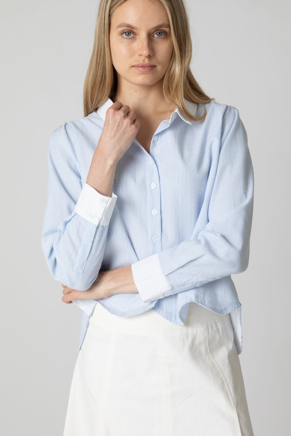 This seersucker Tucana button-down shirt blends classic tailoring with thoughtful details for a polished look. Designed with an oversized fit, it drapes beautifully while maintaining a structured feel. The crisp white collar and cuffs add a refined contrast, while the scalloped front hem and gathered shoulder detail bring a touch of femininity.